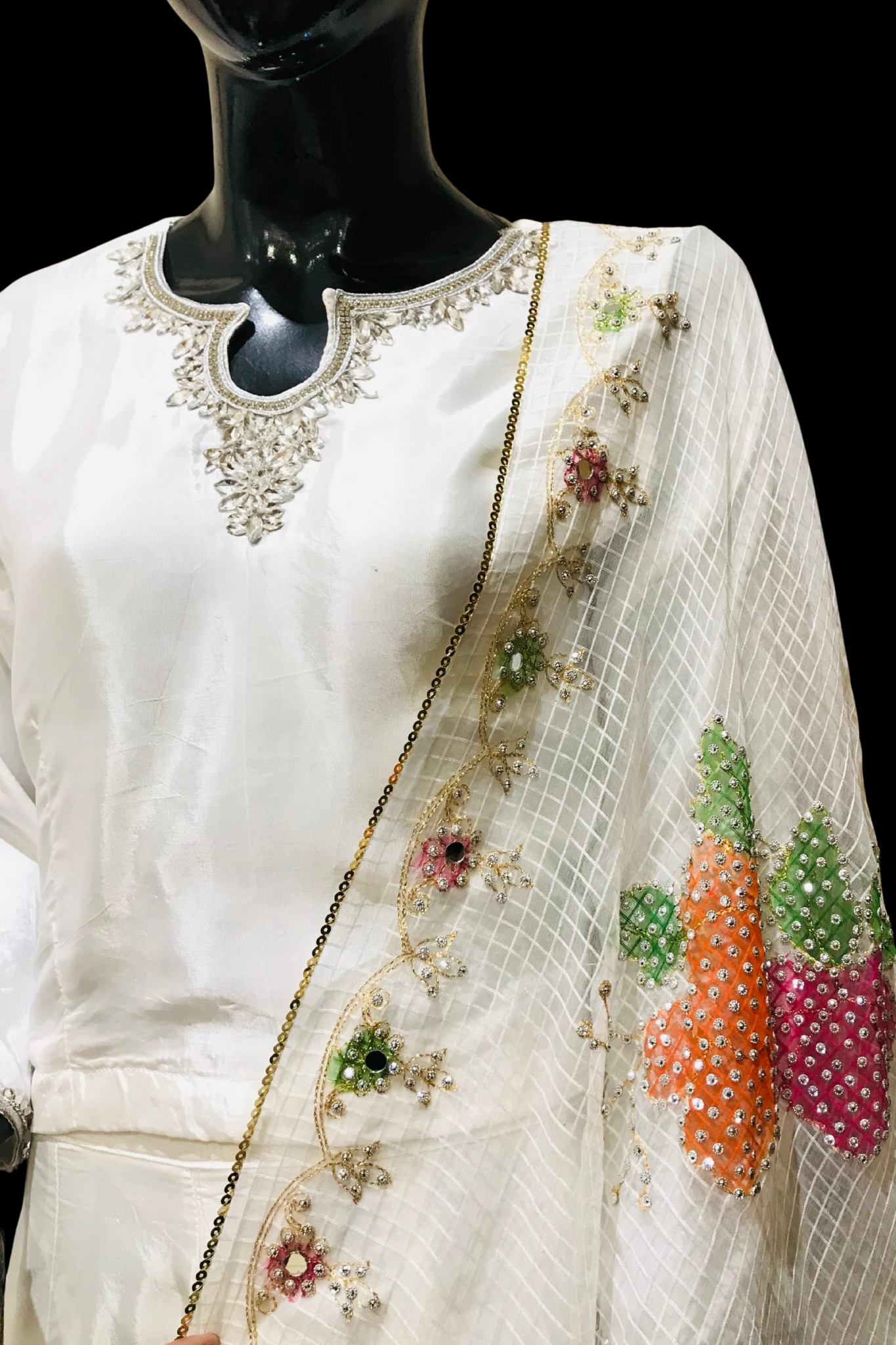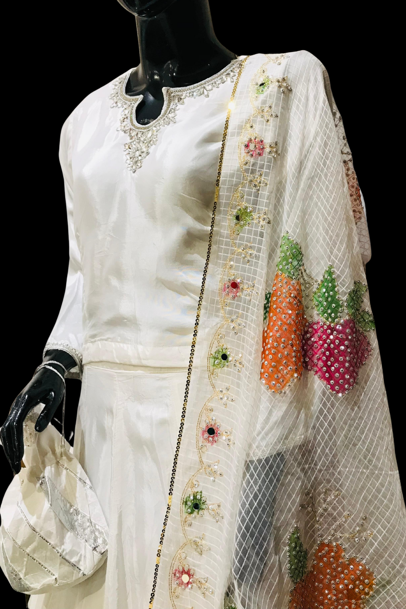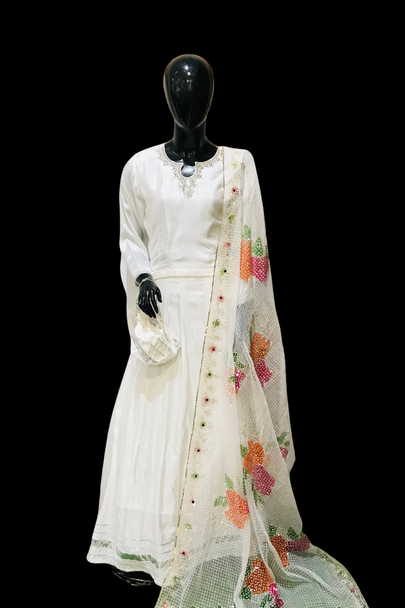 White Aura Bridal Lehenga with Colorful Embroidered Organza Dupatta