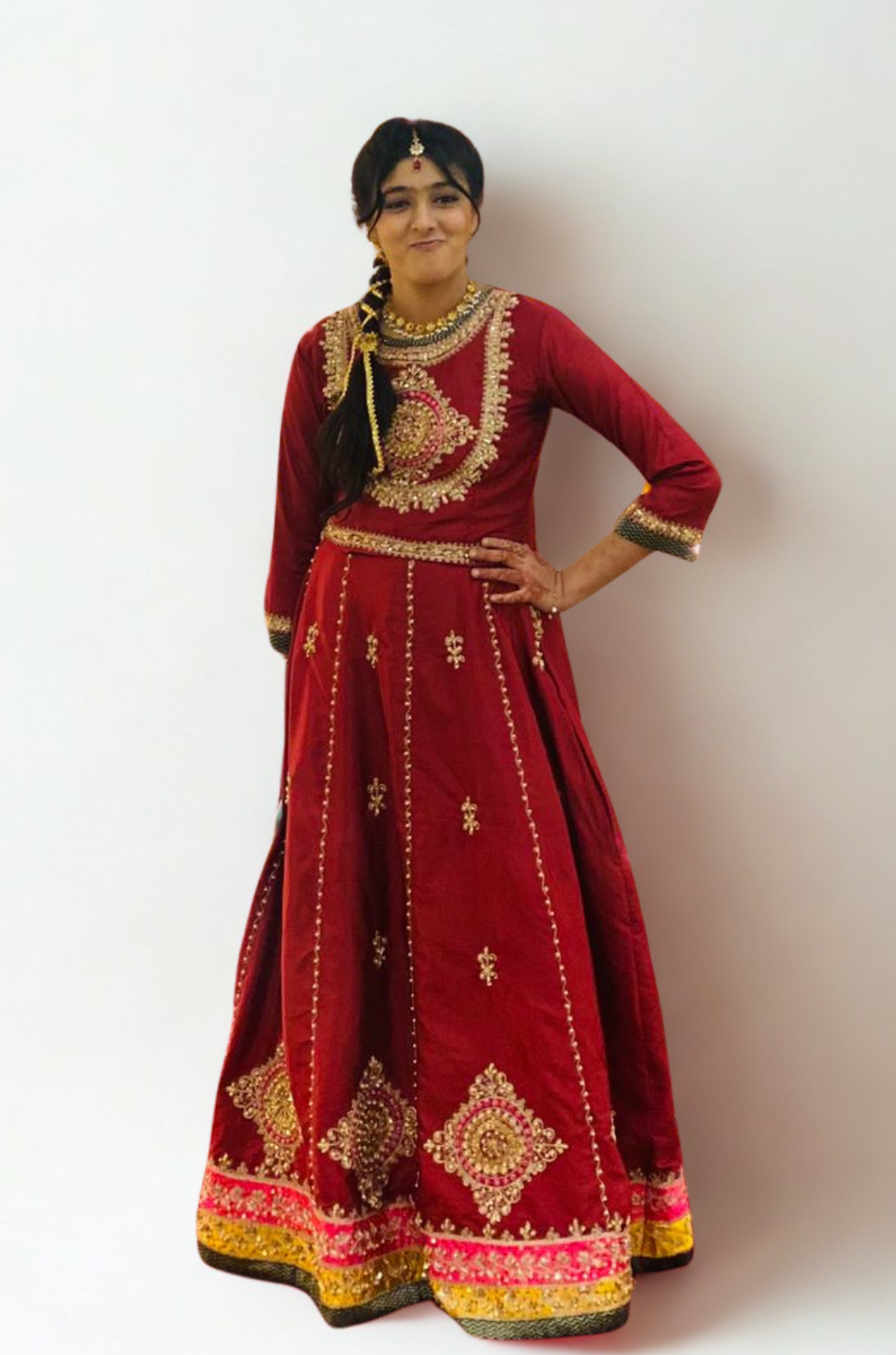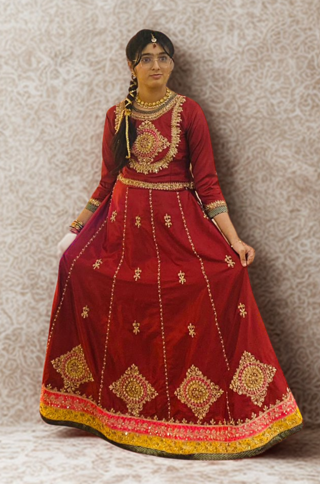 Ari embroidery enhanced with Handwork all over , finished with jamawar edging and a tassle at the back, Lengha has can can inside Lengha Choli and dupatta