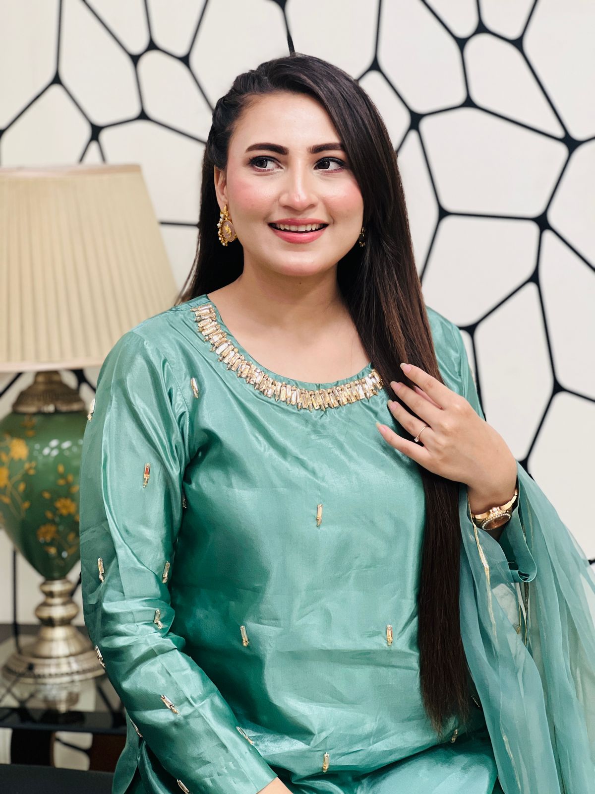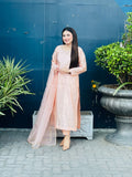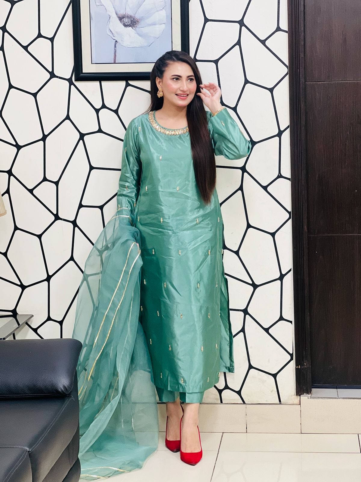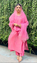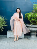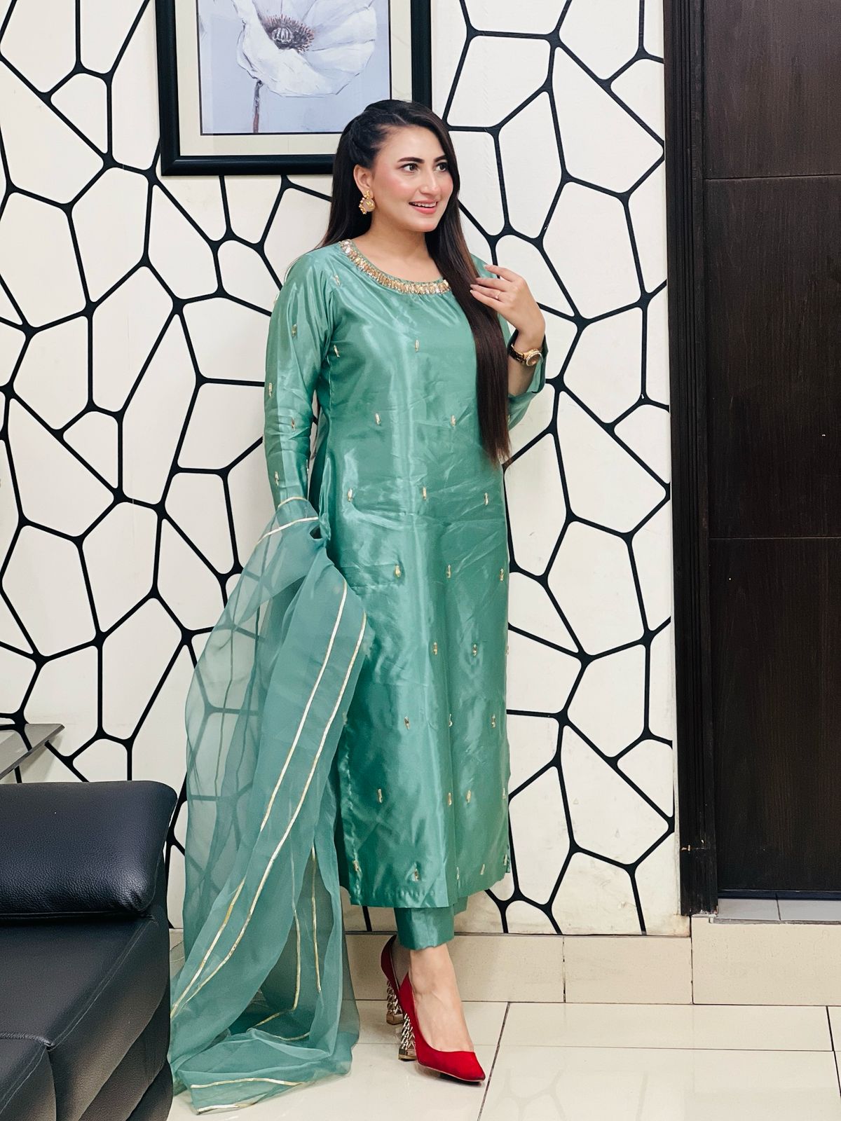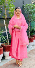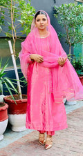 Elevate your wardrobe with this exquisite China Silk Suit featuring a luxurious Farshi Shalwar. The handworked stones embellish the neckline with intricate precision, adding a touch of timeless elegance. The shirt and sleeves are designed with a delicate spray effect, enhancing the subtle texture of the fabric. Paired with an organza dupatta adorned with fine lace, this three-piece ensemble combines comfort with sophisticated style. The straight trousers complete the set, offering a flattering silhouette suitable for special occasions. Crafted with attention to detail, this suit exemplifies refined craftsmanship and graceful design.