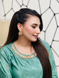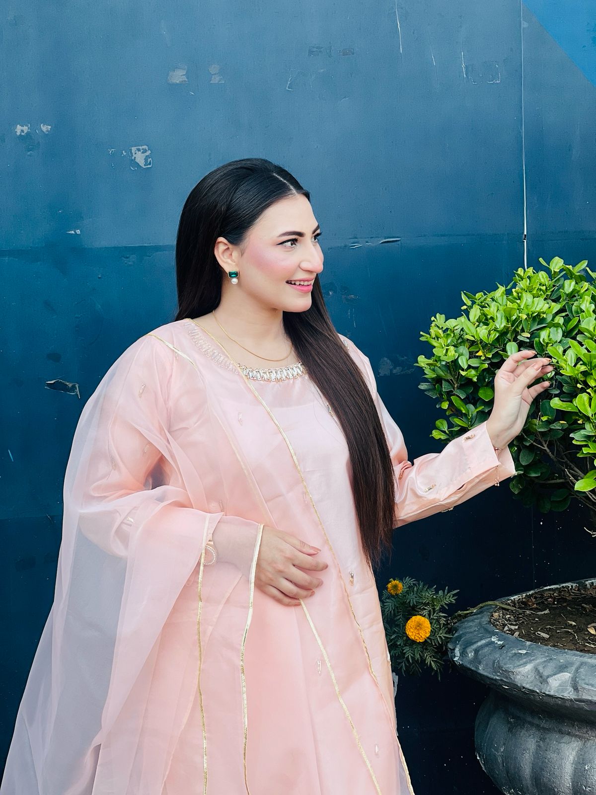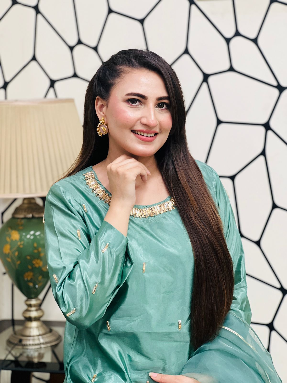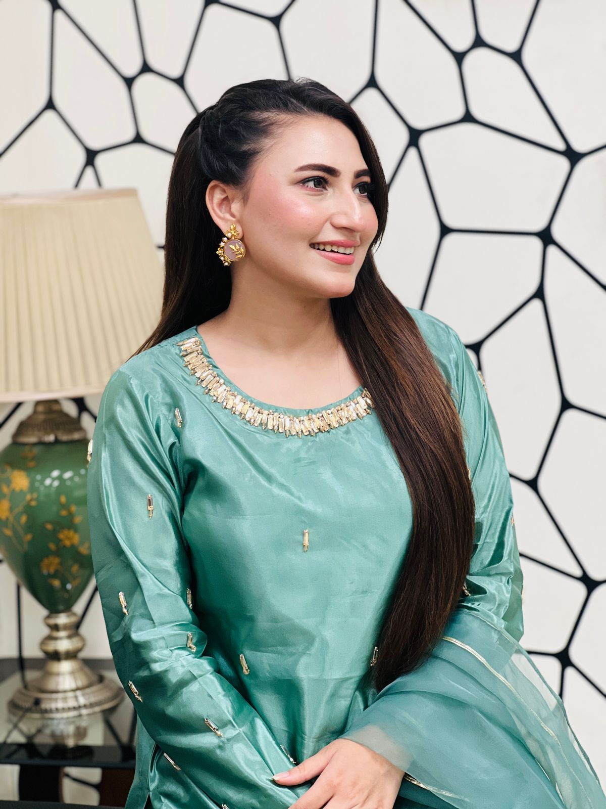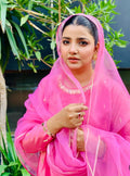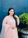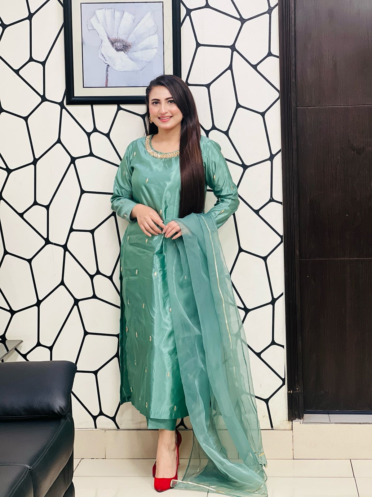 Elevate your wardrobe with this exquisite China Silk Suit featuring a luxurious Farshi Shalwar. The handworked stones embellish the neckline with intricate precision, adding a touch of timeless elegance. The shirt and sleeves are designed with a delicate spray effect, enhancing the subtle texture of the fabric. Paired with an organza dupatta adorned with fine lace, this three-piece ensemble combines comfort with sophisticated style. The straight trousers complete the set, offering a flattering silhouette suitable for special occasions. Crafted with attention to detail, this suit exemplifies refined craftsmanship and graceful design.