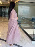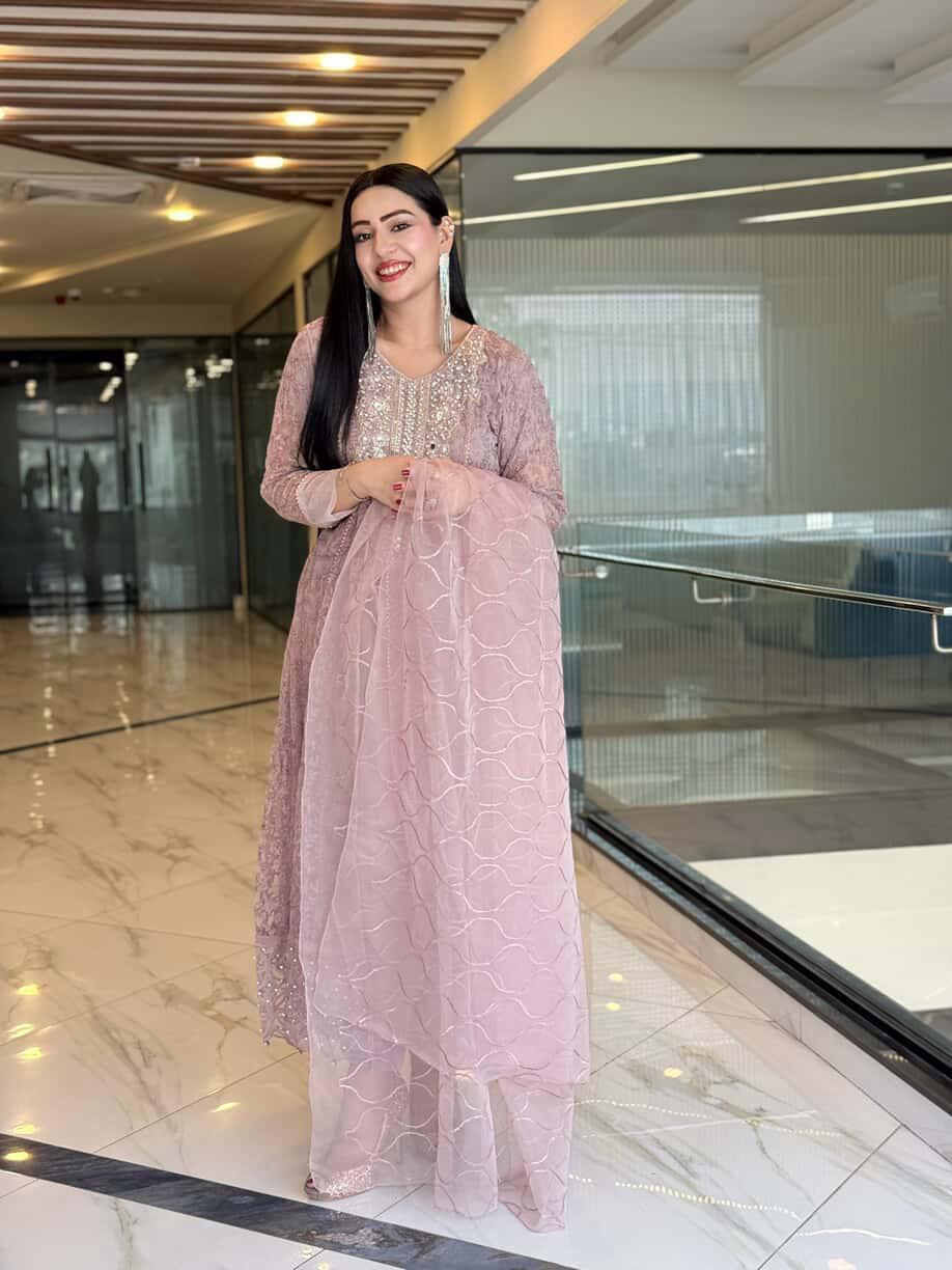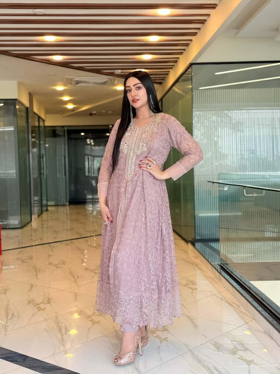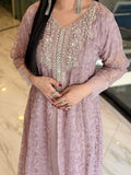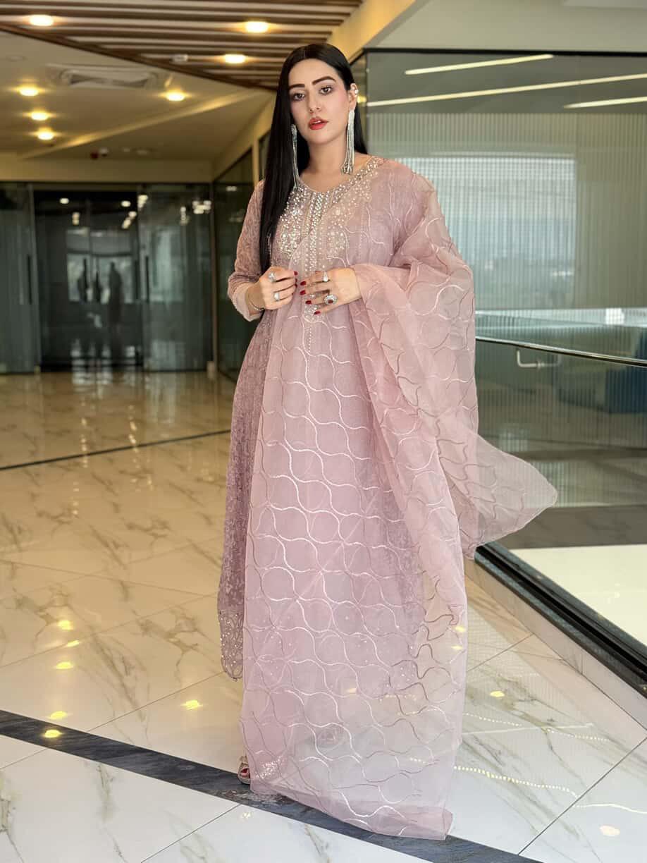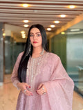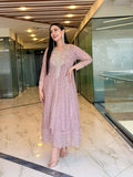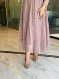 This exquisite three-piece ensemble showcases a net embroidery open gown crafted with a soft lining that ensures comfort and a flattering fit. The neckline and flayer are meticulously adorned with delicate handwork, reflecting skilled artisan techniques that enhance the garment's elegance. Complementing the gown is a finely embroidered organza dupatta, adding a sheer and graceful layer that elevates the overall look. Designed with attention to detail and quality fabrics, this set combines traditional craftsmanship with modern sophistication, making it an ideal choice for formal occasions and celebrations.