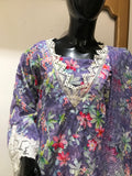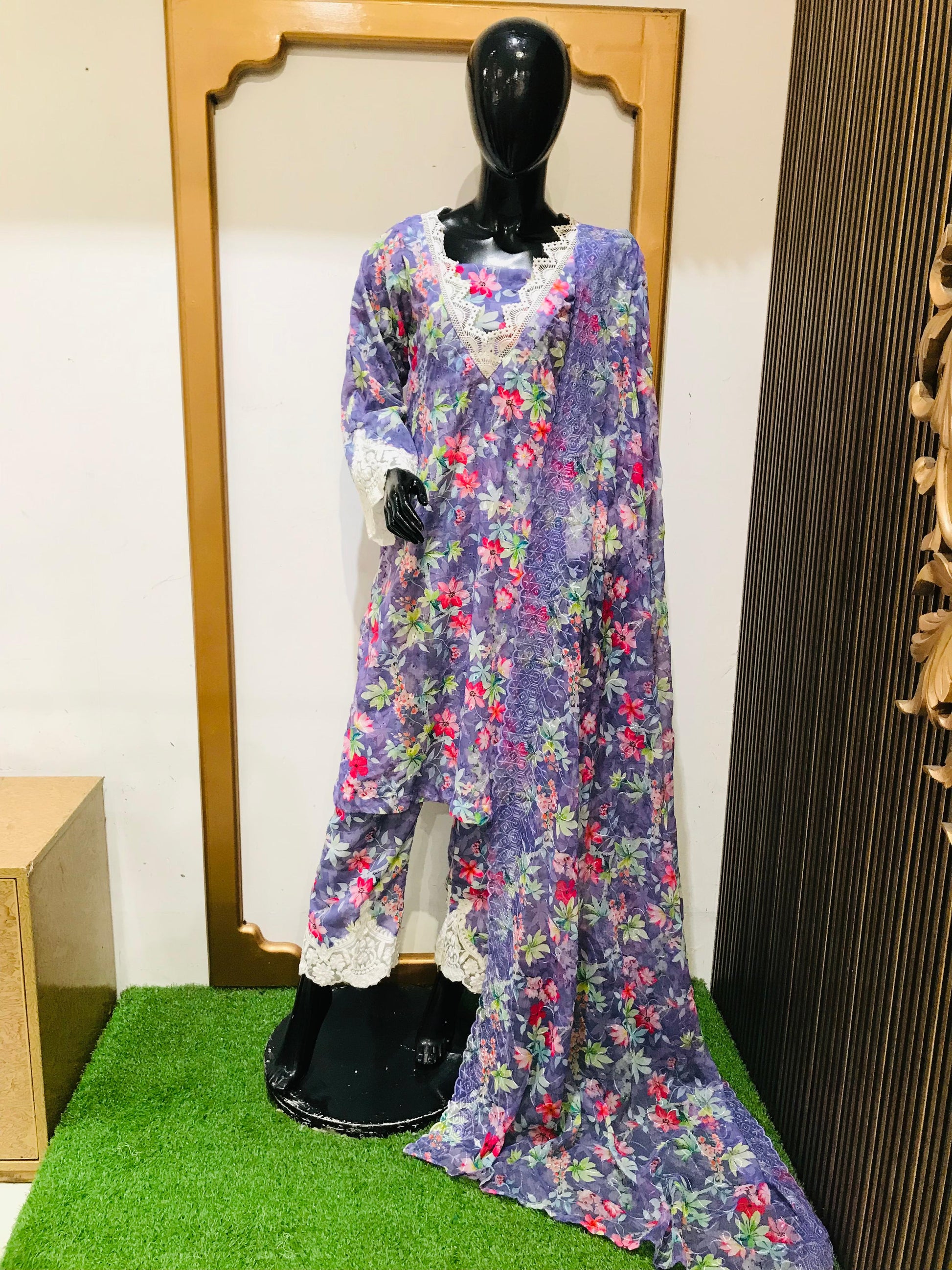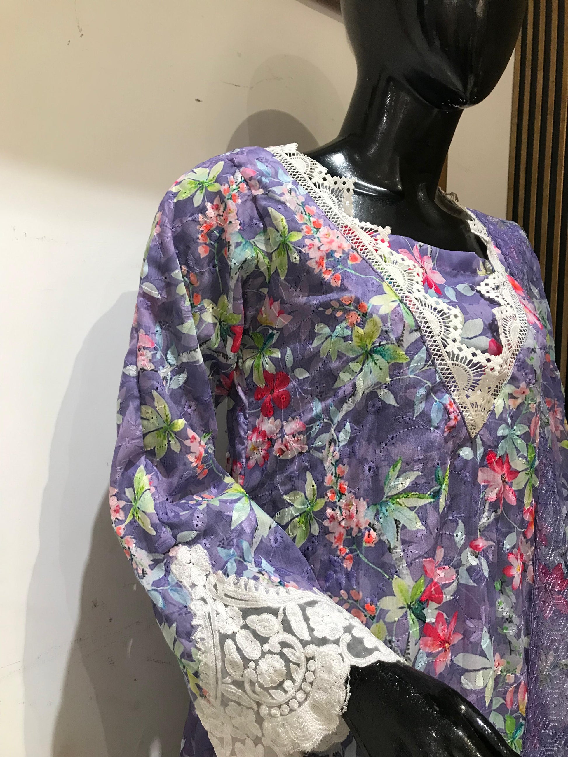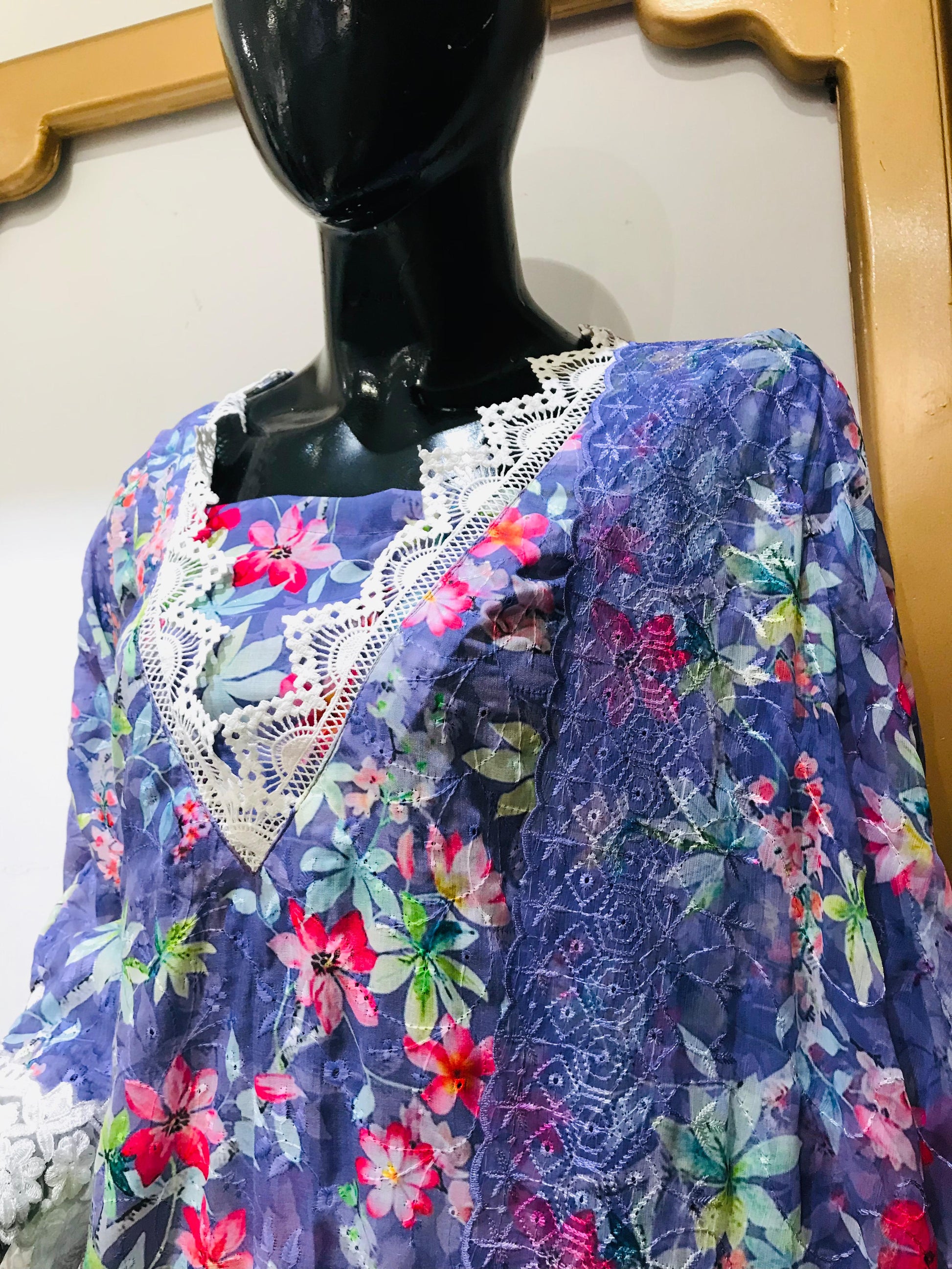 Lawn chicken embroidered shirt, lawn trouser n chiffon chicken embroidered dupatta