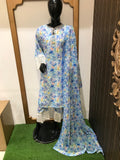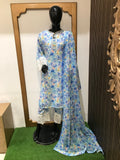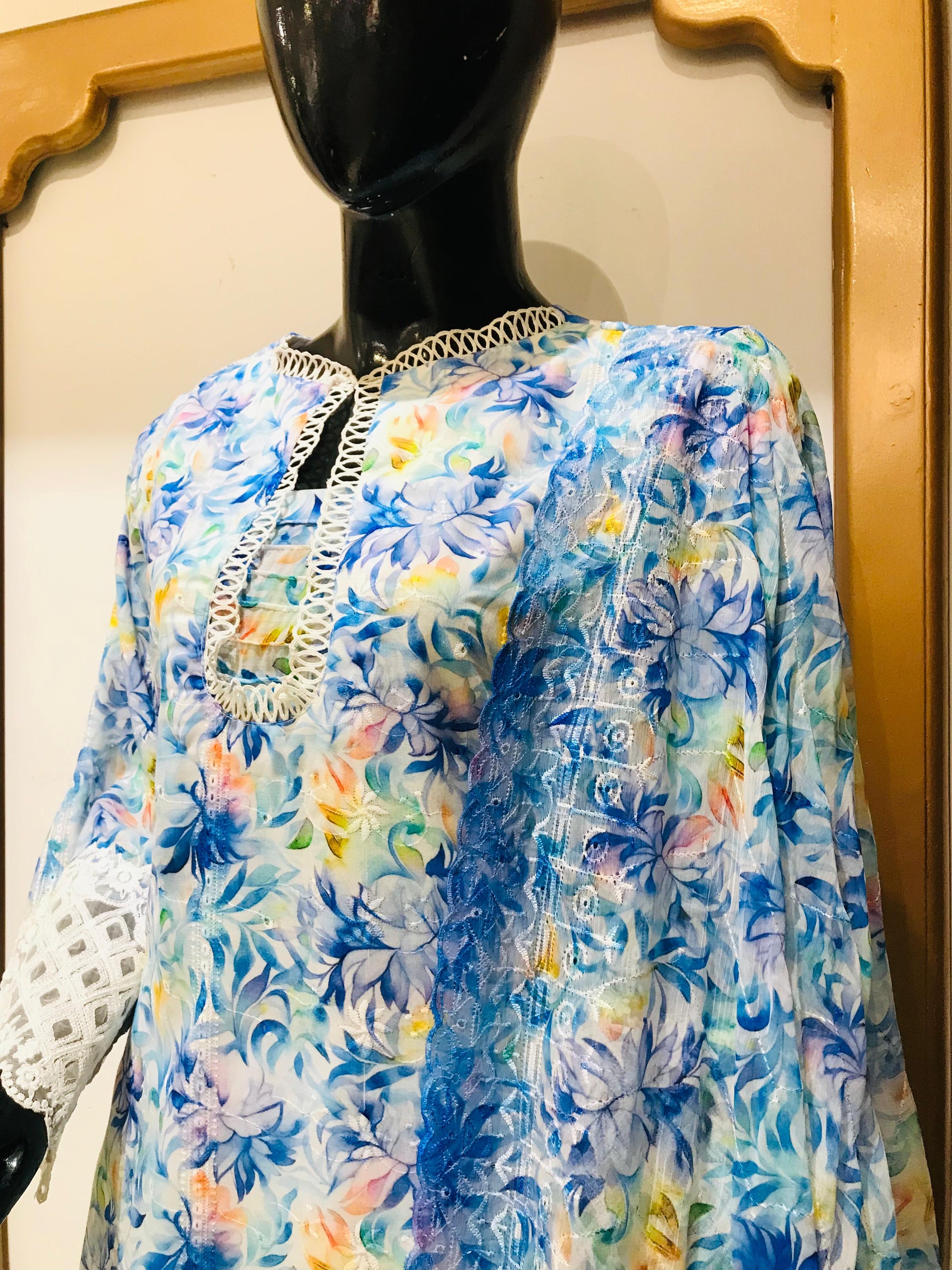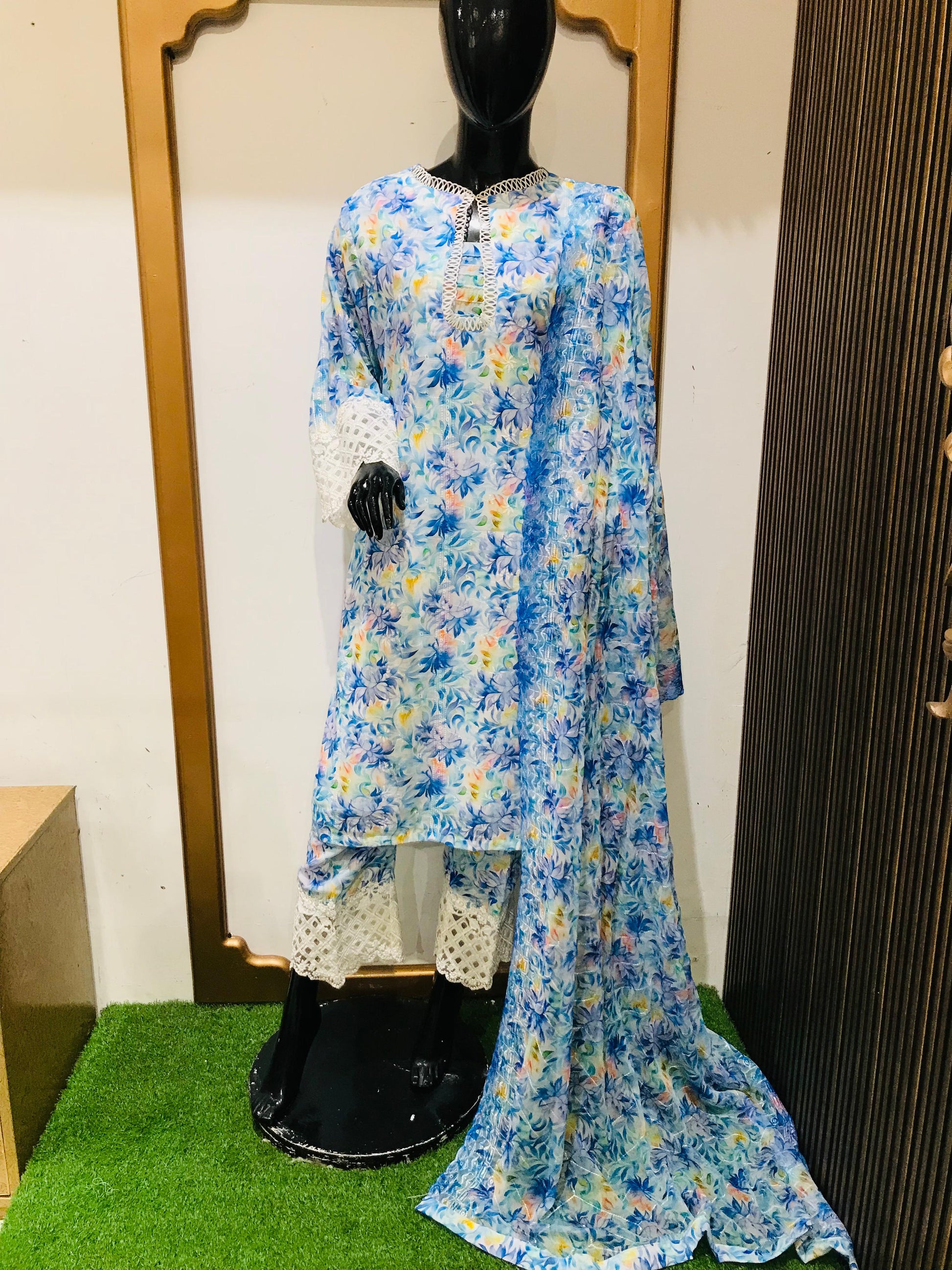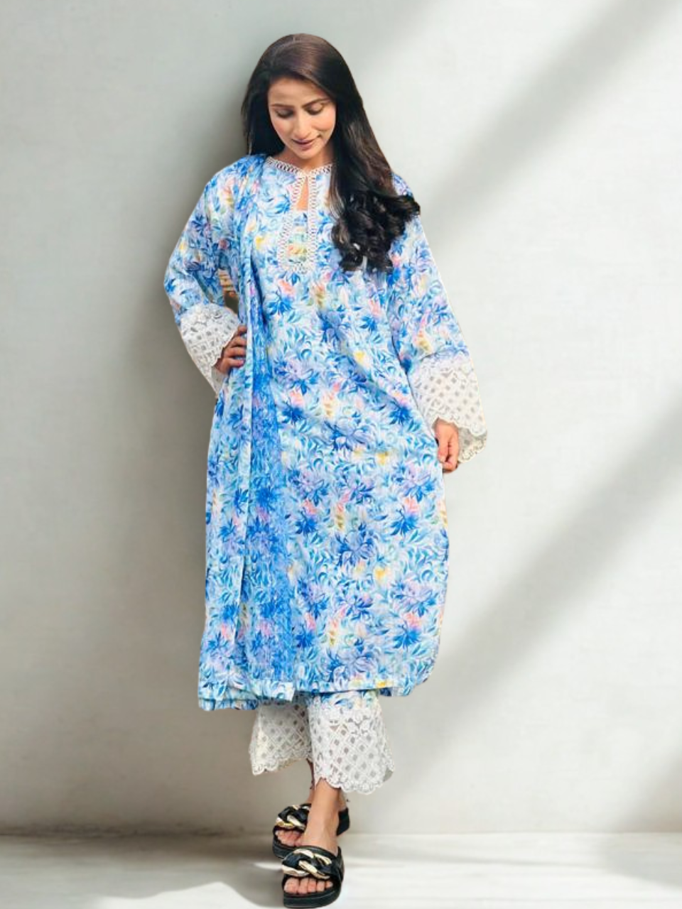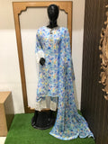Lawn chicken embroidered shirt, lawn trouser n chiffon chicken embroidered dupatta