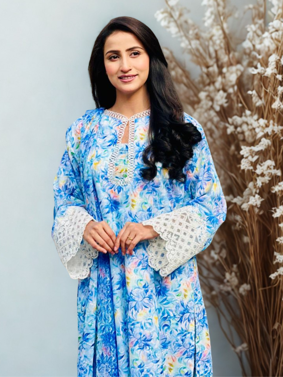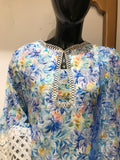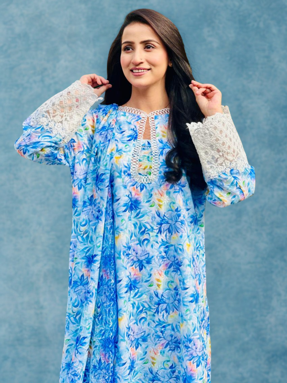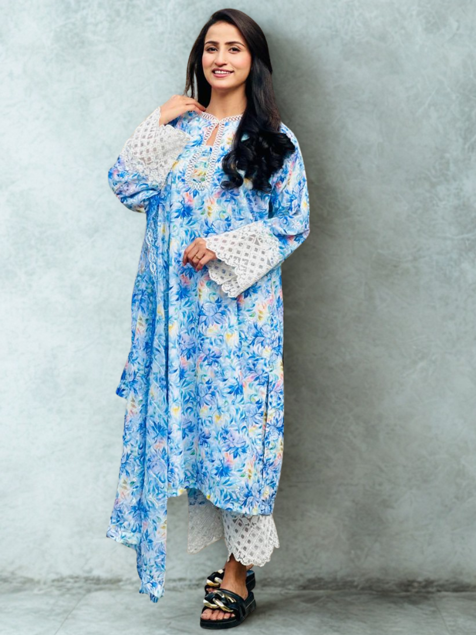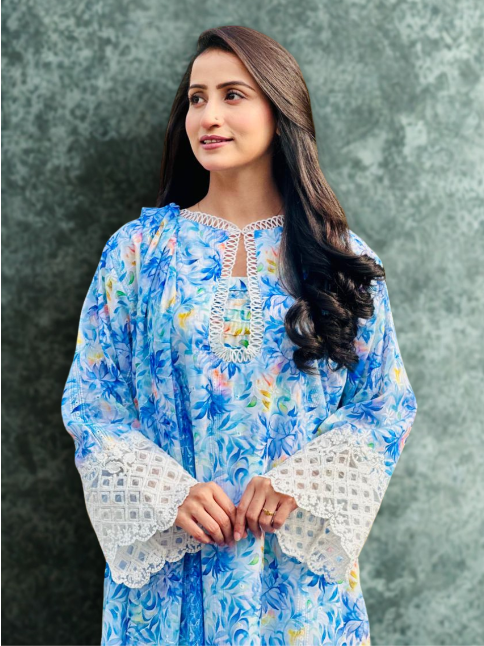 Lawn chicken embroidered shirt, lawn trouser n chiffon chicken embroidered dupatta