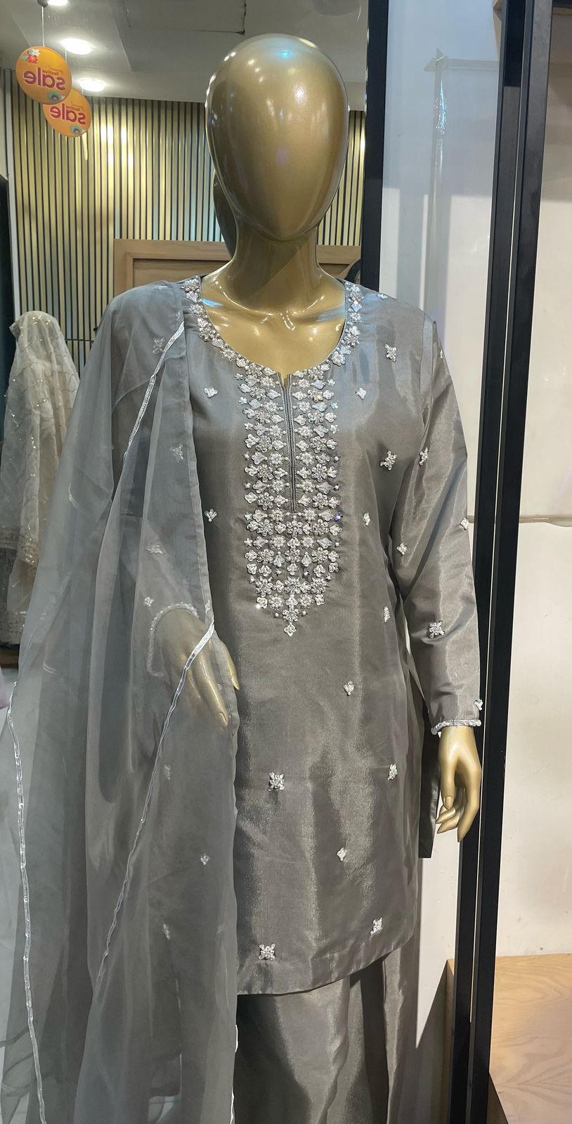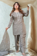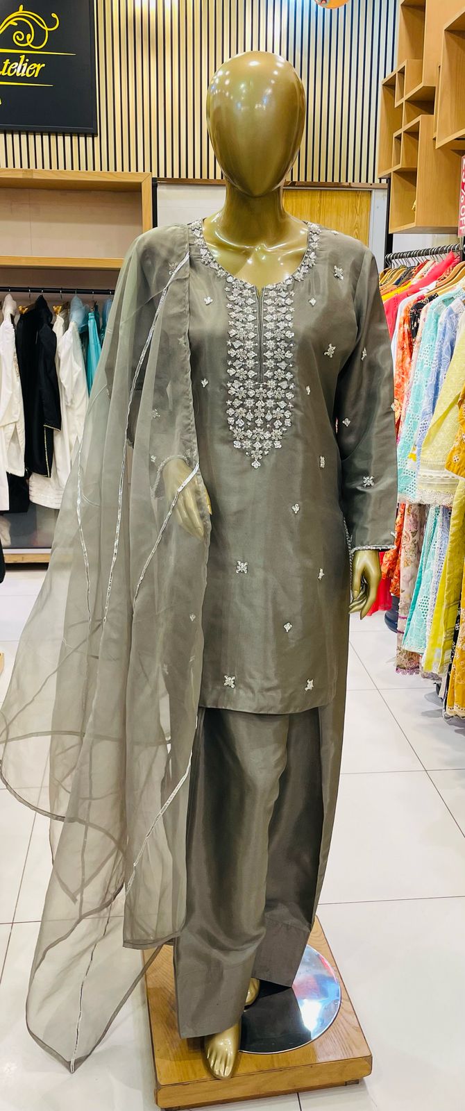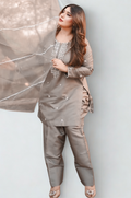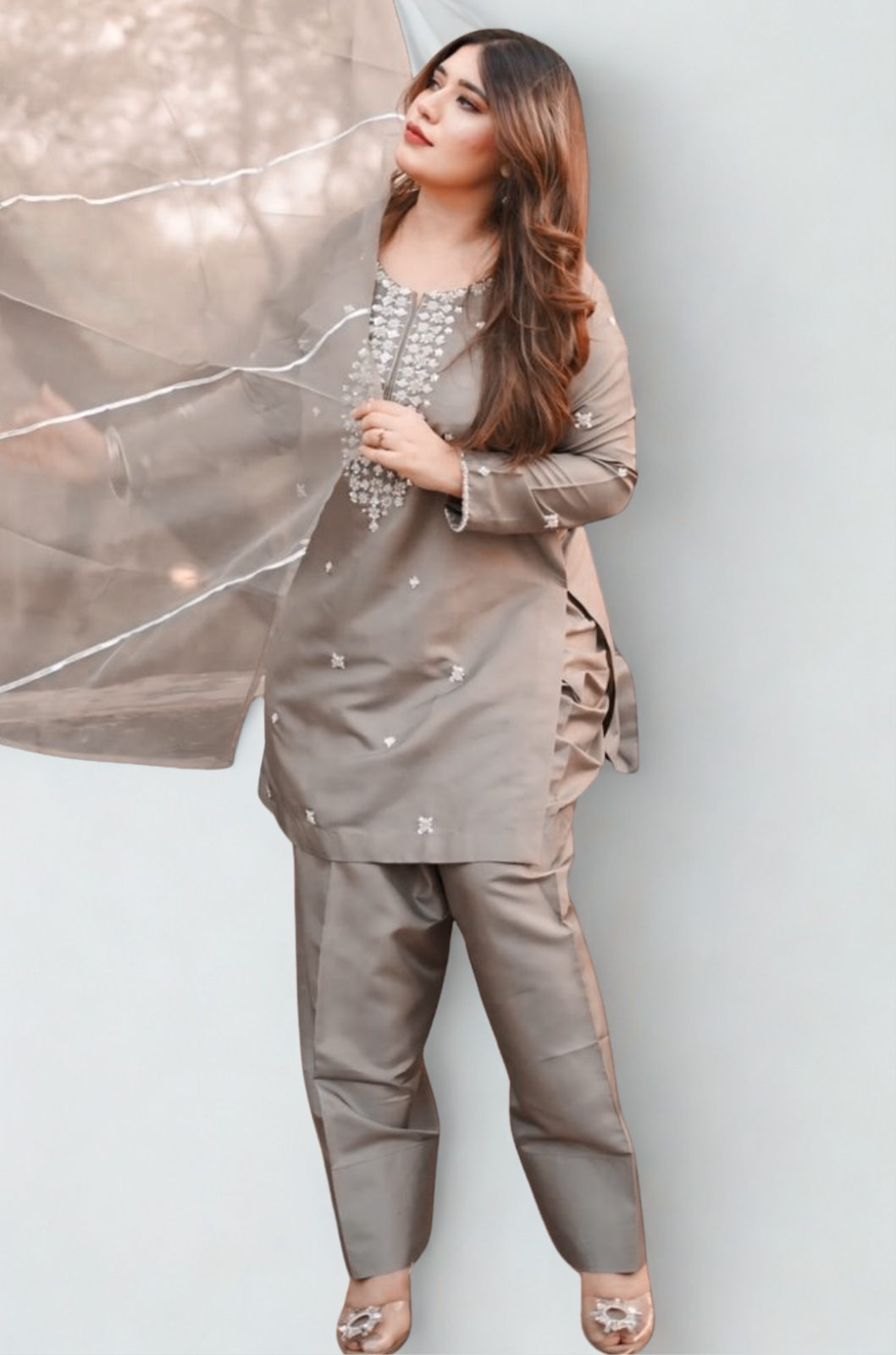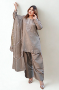 The PALWASHA Dress Shirt Front Handmade Work 3(PC'S) is a bold statement piece featuring exquisite handmade detailing on the shirt front. Paired with a voluminous Farshi shalwar and an elegant organza dupatta, this set commands attention with its dramatic flair and intricate craftsmanship. Perfect for those who dare to stand out, it blends traditional artistry with a striking silhouette, making every occasion unforgettable. Embrace this daring ensemble to showcase your unique style and confidence.