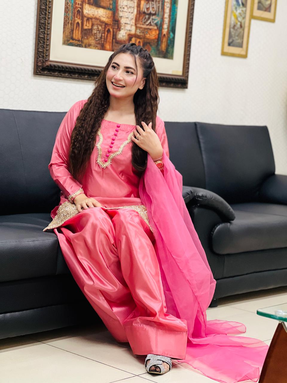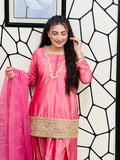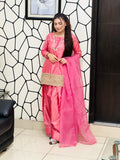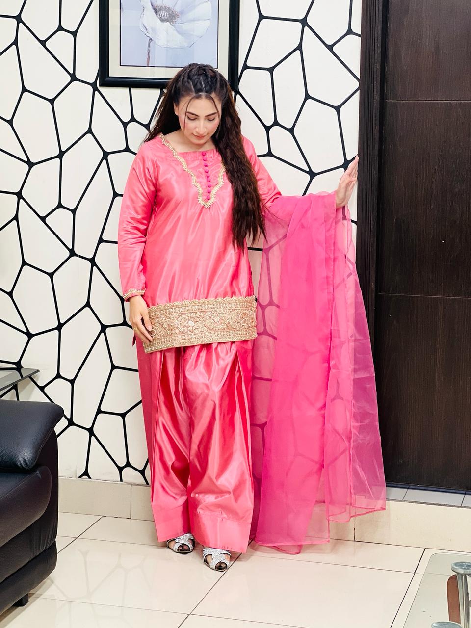 Silk fershy shalwar with short shirt embalish with handwork border with organza dupatta