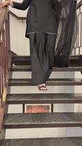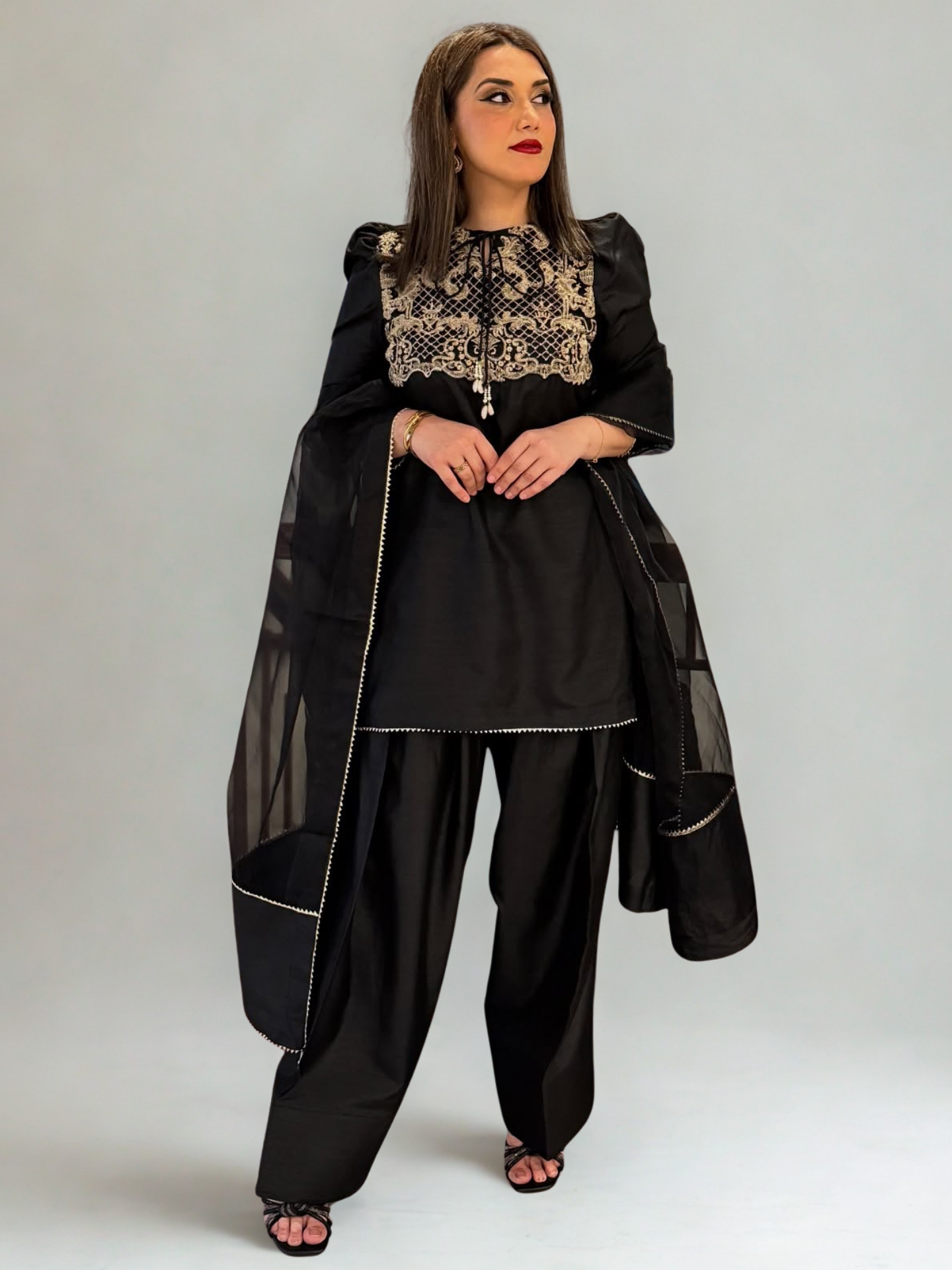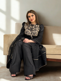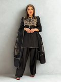 Crafted from premium raws silk, this Farshi suit is distinguished by intricate Tilla embroidery embellishing the neckline, showcasing meticulous handwork characteristic of traditional craftsmanship. The hem features a refined lace finish that enhances the garment's structured flow, while the complementing organza dupatta is adorned with delicate trimming, adding subtle sophistication to the overall ensemble. Ideal for formal gatherings and cultural events, this suit balances luxurious texture with expert detailing, ensuring both elegance and comfort for the discerning wearer.g